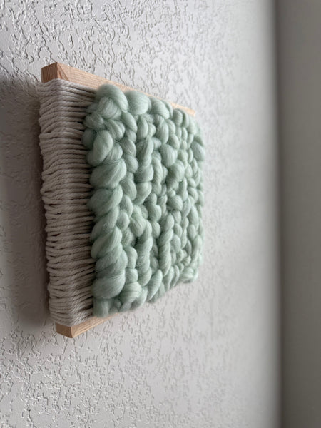 +This mounted weaving measures approximately 8” x 8”.